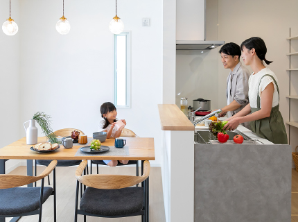 限られた敷地でも家族が広々と暮らせる2階建て住宅。リビングイン階段や開放的なLDK、広い洗面や共働き夫婦に嬉しい家事動線など、家族の暮らしを快適にする多彩なプランをご用意しています。