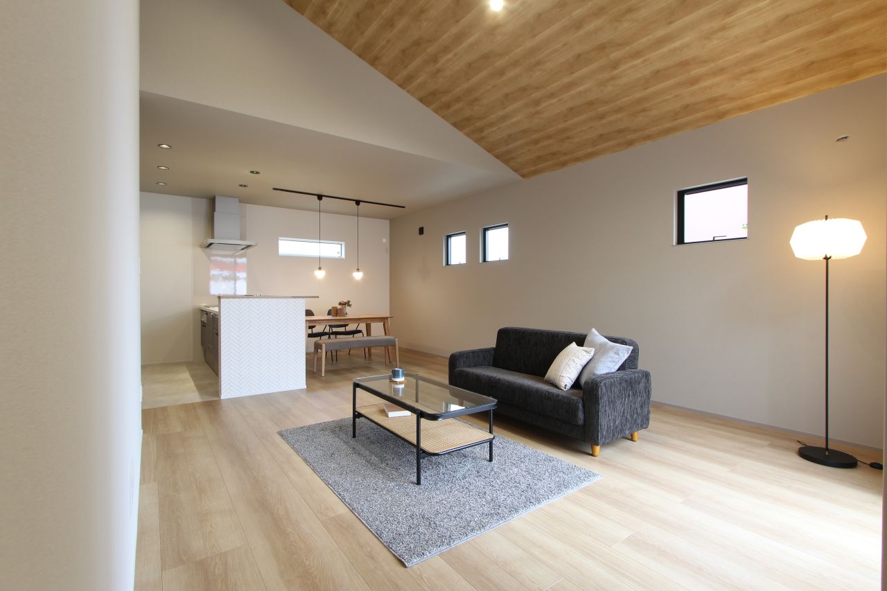 天井の高さと木目のアクセントで、ゆったりくつろげる空間。
