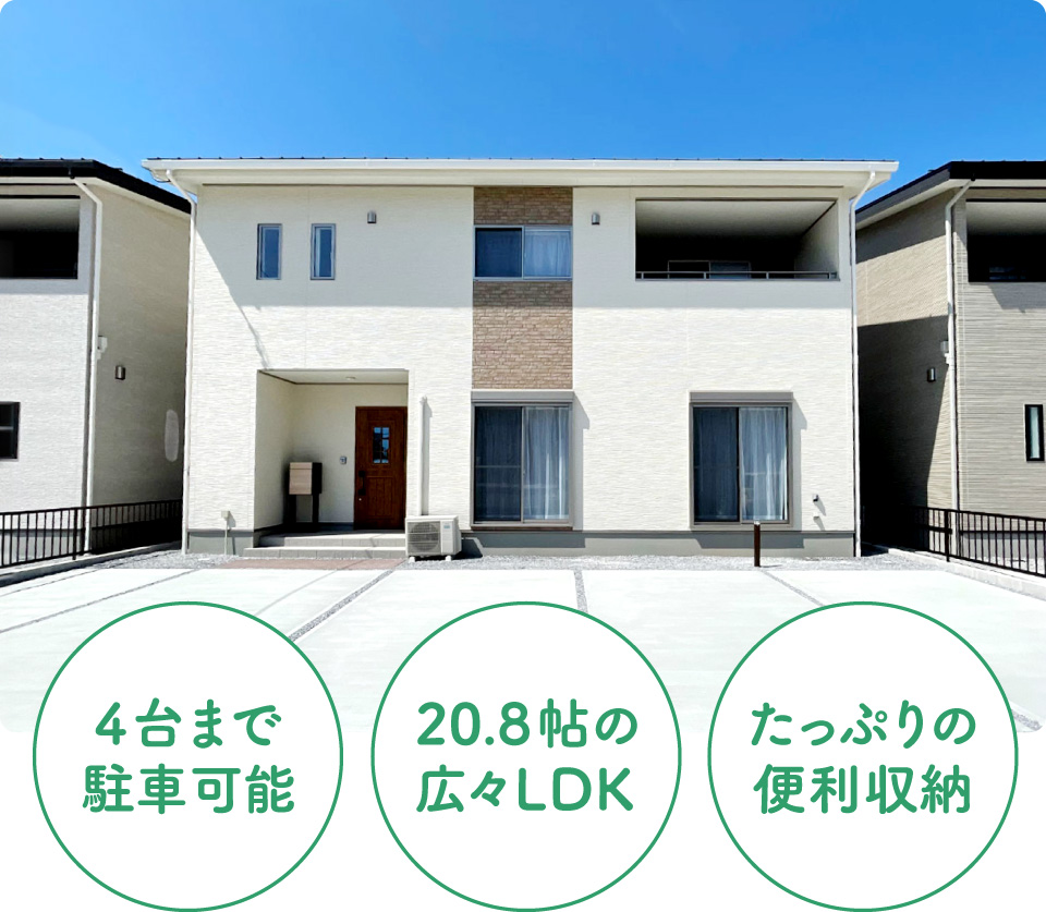 4台まで駐車できる敷地は、来客時も安心のゆとりある広さ。