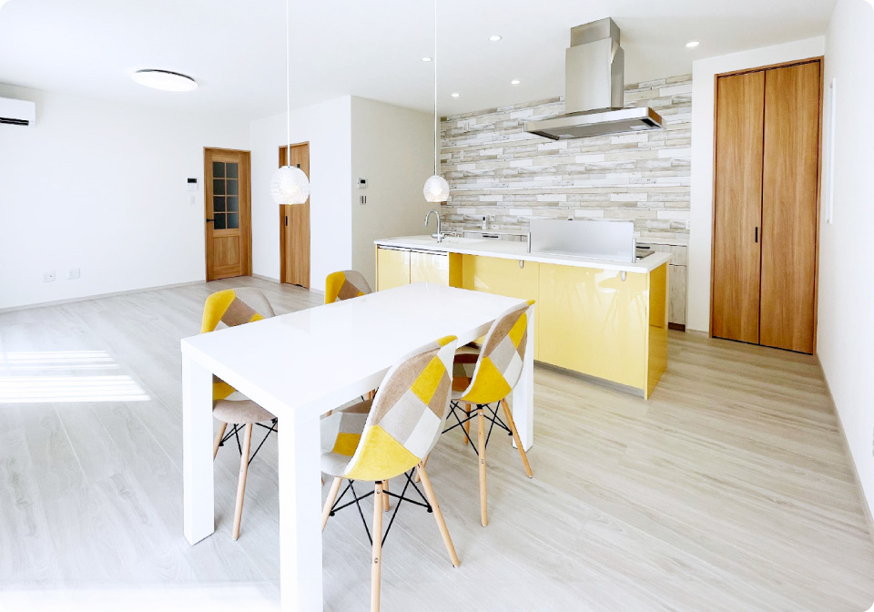 イエローのアイランドキッチンが主役の20.8帖カフェ風LDKは、家族や友人との会話が弾む心地よい空間です。